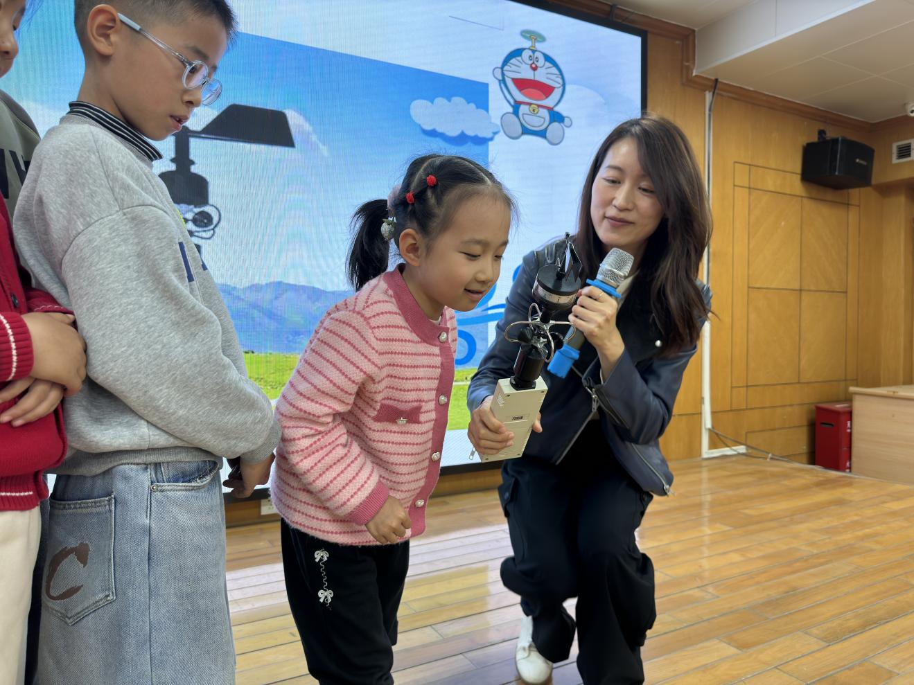 讲座中,宋老师紧扣第66个世界气象日“测今日气象 护明日家园”的主题,从大家熟悉的天气现象入手,深入浅出地介绍了气象观测的方法与设备。她结合丰富的专业知识和生动的案例,详细讲解了风、雨、雷电等常见天气现象的形成原理,以及相应的古代、现代测量仪器与防御知识。现场还播放了台风、雷电等气象灾害的相关视频,让同学们直观感受到极端天气的威力与破坏性,进一步加深对气象灾害的认识。在互动环节,通过比一比谁是“风王”的小游戏,宋老师带领同学们体验手持测风仪,并讲述判断风向与风速的方法,现场气氛热烈,同学们踊跃参与。