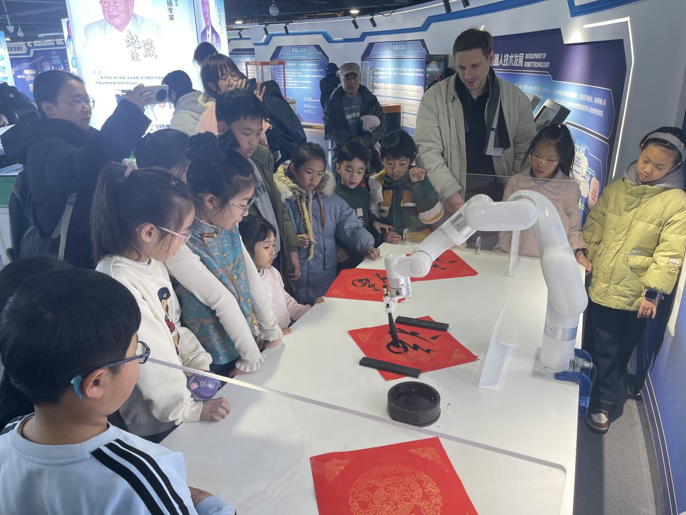 今年春节,青岛市科技馆人工智能展厅焕新亮相。新引入的“AI绘梦坊”,观众只需说出想象中的画面,生成式AI便能在数秒内绘出风格各异的作品;“表情机器人”端坐桌旁,实时捕捉观众的面部神情,弯起眉眼,微微歪头,或惊喜或困惑,引得观众争相与它“对眼神”。传统展品同样在创新中焕发活力:由机器狗改装而成的“机器马”踩着喜庆鼓点,踏步、转身、昂首、小跑,孩子们伸出手想摸摸它,又在它灵巧闪避时笑成一团;书法机器人展位前,一支毛笔在机械臂的精准操控下挥洒自如,一个个端庄饱满的“福”字跃然纸上,孩子们双手接过这份“科技福”,欣喜不已。