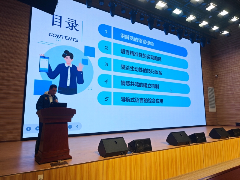 活动特邀行业权威专家与实战精英分享,打造“理论深耕+案例拆解+互动实操”的立体化提升体系。青岛市广播电视台全媒体节目中心生活服务部副主任、山东省播音主持专业高级评审委员会委员、青岛市广播电视台播音指导张国群,以《为你的语言装上“导航”》为题,从语音语调控制、肢体语言运用、互动感与对象感塑造等核心维度展开分享,通过现场示范,指导讲解员们掌握将抽象科学知识转化为“接地气”表达的技巧,让讲解既有科学精度又有情感温度。第五届山东省科普讲解大赛科普工作者组一等奖获得者崔一雪,带来《科普小白的蜕变之旅——从科普比赛说起》专题分享,结合自身备赛经历与一线展教经验,深入解析科普内容筛选、趣味互动设计、突发情况应对等关键问题,通过真实案例赏析,为学员提供可直接落地的讲解优化方案与赛事备赛思路。