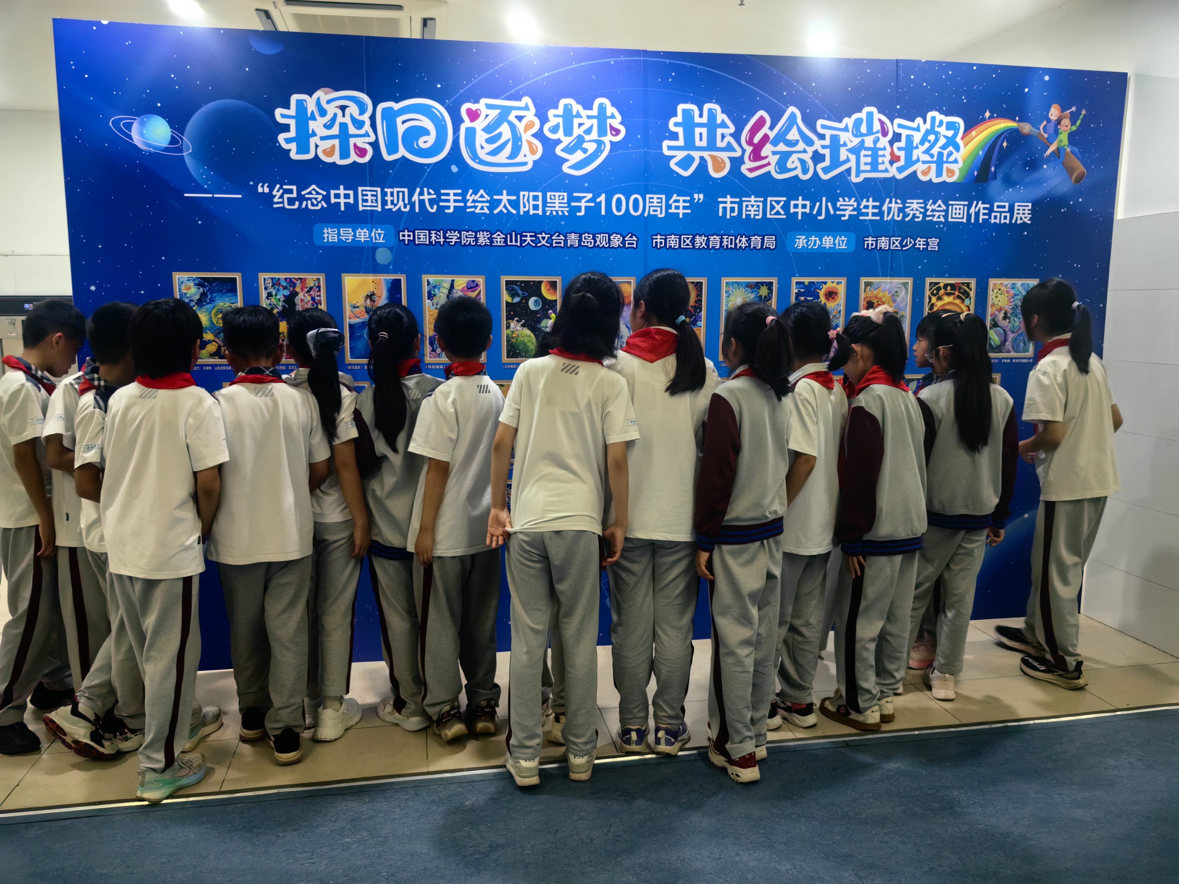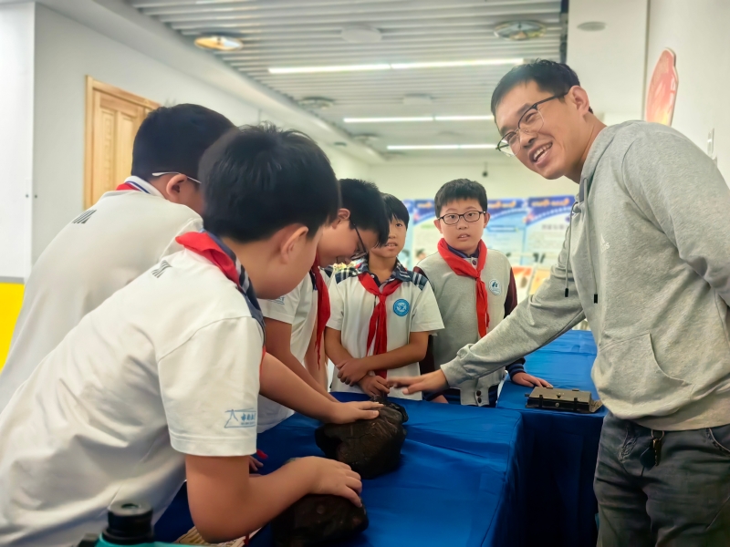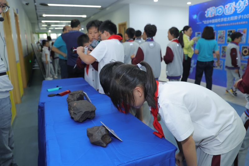 科普资源观摩展区内,学生们触摸陨石,观看优秀太阳黑子绘画作品,体验科学演示仪器,共同开启了一段奇幻又特别的科学探索旅程。