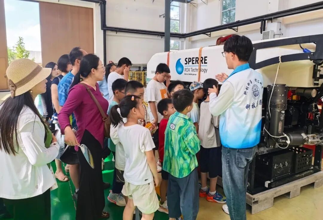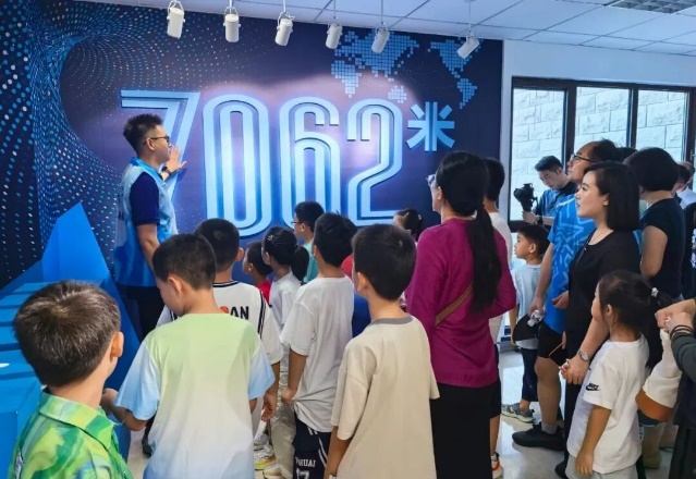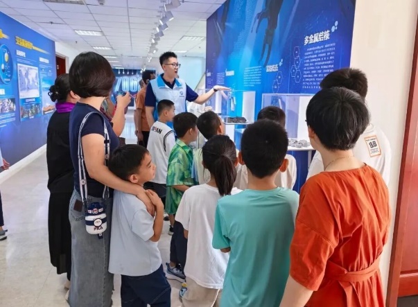 在讲解员带领下,孩子们首先走进“深海之路”科普馆。展厅内,“蛟龙”号从深海带回的样本有序陈列,针对热液、多金属硫化物等专业知识,讲解员进行了细致解读,让原本复杂的概念变得清晰易懂。屏幕上播放“蛟龙”号在深海拍摄的珍贵视频时,展厅内逐渐安静,孩子们专注凝视,仿佛在沉浸式感受漆黑深海中蕴藏的神秘。一位同学忍不住感叹:“原来‘蛟龙’号能潜那么深,太神奇了!”