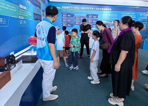 随后,队伍前往“深海之路”成就馆。在深海战略展厅,我国在公海及国际海底区活动的重大成就一一呈现。展柜里“蛟龙”号带回的海底珍贵标本、精准还原的深潜器工作模型。期间,不少同学驻足观察,眼神里满是对深海科研事业的憧憬和关注。三年级的欣欣感慨道:“原来厉害的海洋成果背后是这么复杂的工作,太了不起了!”