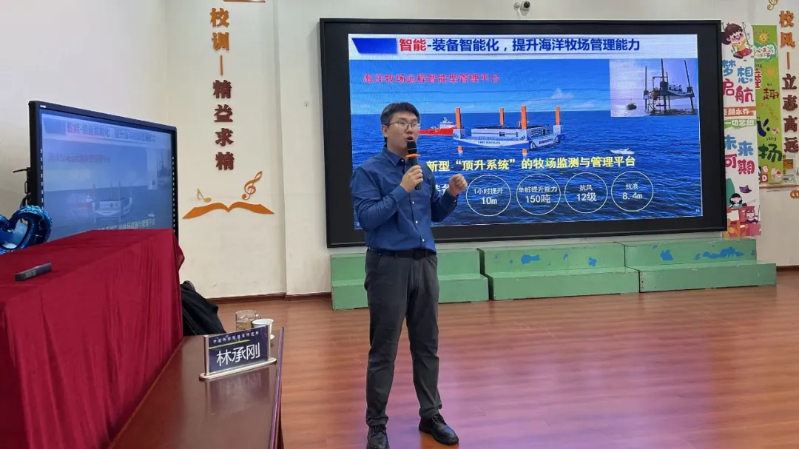 活动中,林老师不仅介绍了地球表面约71%为海洋、马里亚纳海沟深度达11034米等海洋基础常识,还系统梳理了海洋牧场从1.0时代的人工鱼礁、增殖放流,到2.0时代融合休闲渔业与生态修复,再到3.0时代迈向全域化、精准化、智能化的发展历程,让同学们深入了解我国在海洋生态保护、渔业资源养护领域的科技突破与实践成果。